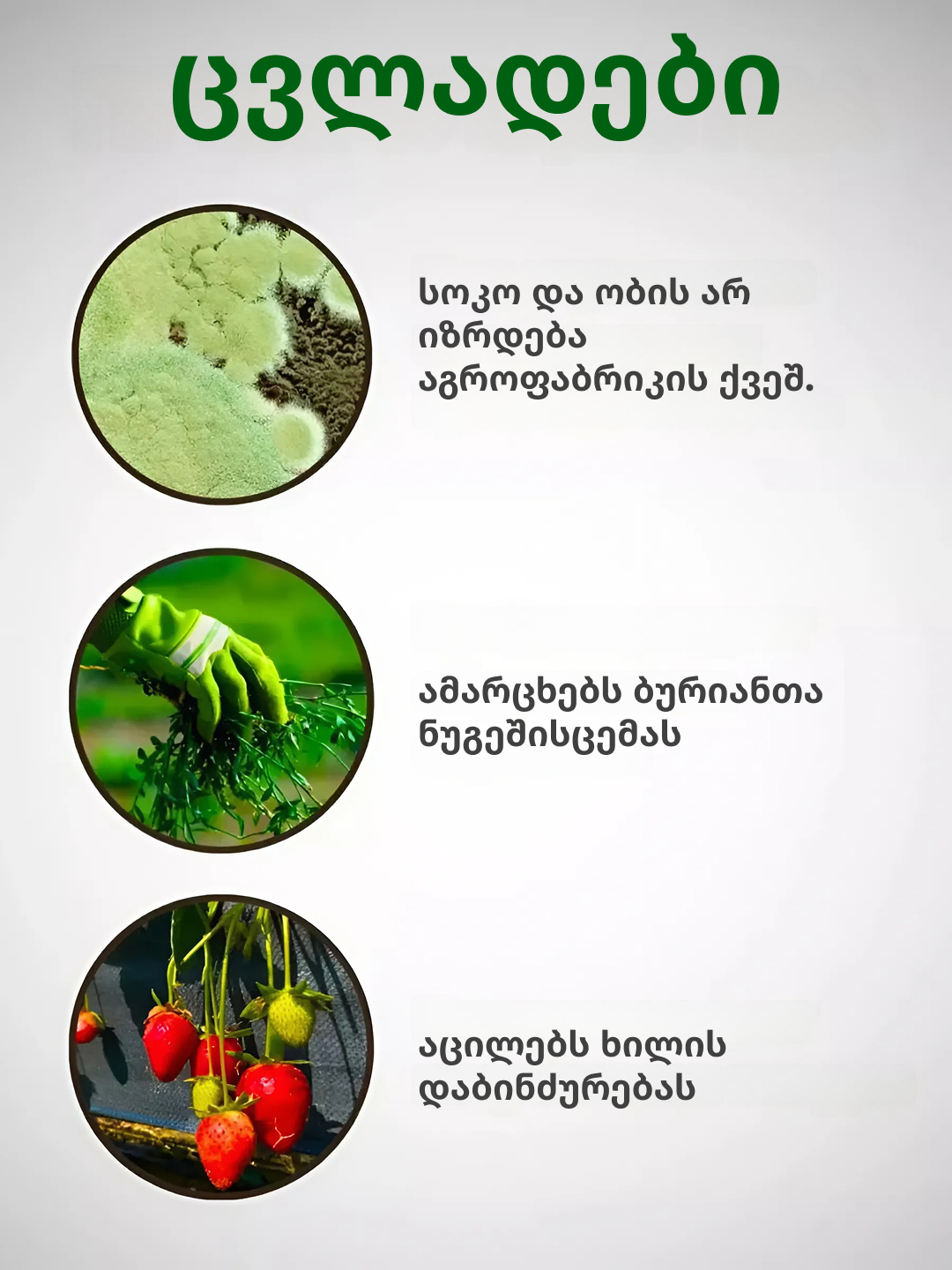 წარმოიდგინეთ: საათობით ატარებდით სარეველას, საწოლებს იხრებოდით და ჭუჭყის ყოველი ლაქა მოგაგონებდათ დახარჯულ ძალისხმევას. ახლა - ხელის ერთი მოძრაობა და პრობლემა წლების განმავლობაში ქრება! ამ ქსოვილის გარეშე, თქვენ დაუბრუნდებით ჭუჭყიან სარეველას, დაბნეულ ხელებს და გაუთავებელ ბრძოლას ბალახთან. ამ სიმსუბუქისა და თავისუფლების გარეშე ვეღარ იცხოვრებ ბაღში!
